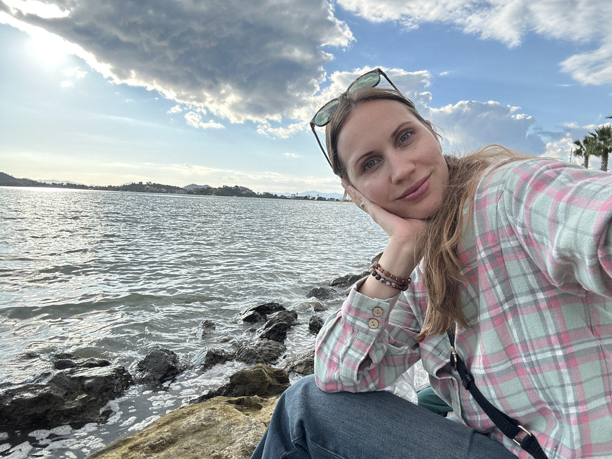 A selfie depicts a woman sitting beside the sea in Fethiye, Turkey