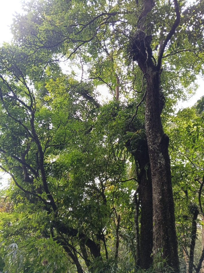 The image displays an upward-facing perspective into a dense tree canopy, located in the vicinity of Bangalum Bridge, Papua New Guinea. The scene is dominated by multiple large trees with verdant foliage. A prominent tree trunk, dark brown and textured with visible bark and clinging epiphytic growth, occupies the right side of the frame, extending upwards and out of view. Multiple branches, laden with various shades of green leaves, extend across the upper and middle portions of the image, forming a thick, interwoven canopy. Smaller tree trunks and branches are visible to the left, also covered in dense green leaves. Patches of bright, diffused white sky are discernible through openings in the foliage, indicating ambient light filtration. No individuals, animals, or man-made objects are present. The environment is an unpopulated, natural forested area.