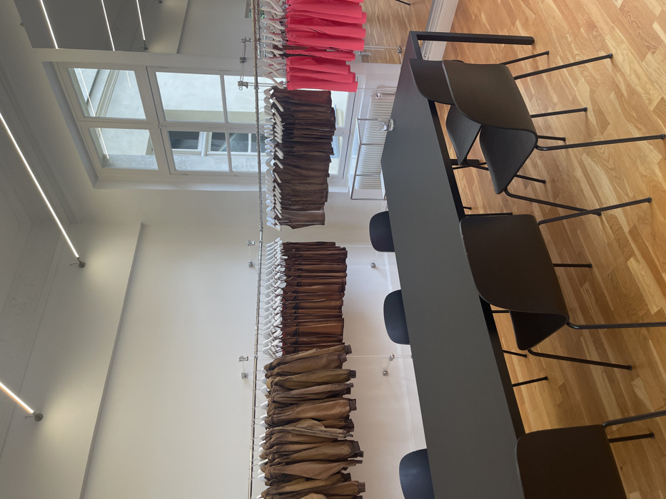 This image displays a well-lit, unoccupied interior space, identified as a commercial showroom or meeting room within the city of Paris, France. The room features white walls, a light wooden parquet floor, and a white ceiling with subtle decorative molding. Two linear LED light fixtures are mounted on the ceiling. Along the left and back walls, two horizontal metal clothing racks are affixed. The rack on the far left holds approximately thirty brown leather or faux-leather jackets on white hangers. The back rack displays over fifty brown skirts or pants, followed by a section with approximately twenty brown sleeveless tops, and finally, about twenty bright pink skirts or shorts, all presented on white hangers. In the foreground and center, a large, rectangular black table is positioned, surrounded by eight black chairs with black metal legs. Five chairs are clearly visible in the foreground, with three more partially obscured behind the table. A single clear drinking glass rests on the table's right side. A large multi-pane window on the right wall overlooks an exterior building or courtyard. A white radiator is installed beneath the window. To the right of the window, a tall, rectangular mirror reflects a portion of the room, including the window and ceiling lights. The scene is static, with no individuals or activities present.
