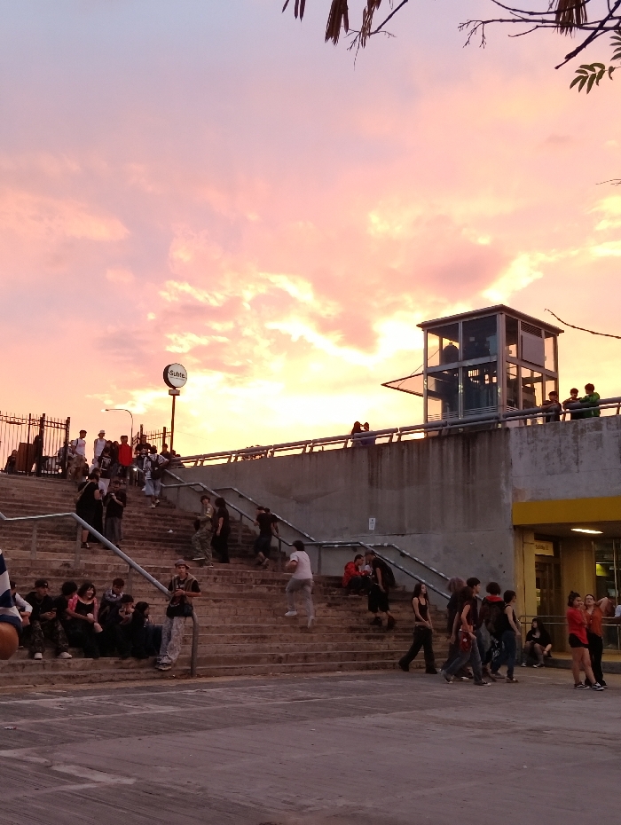 A diverse group gathers near an elevated station at sunset. Many are on the stairs, some sitting. A glass elevator shaft stands above the station platform. A sign is affixed to a pole. The sky is a vibrant mix of pink, orange, and yellow hues. Silhouetted figures line the railing above the steps. The overall atmosphere appears relaxed and social.