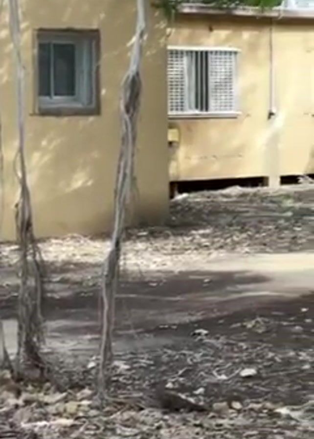 large banyan tree. The tree is in a grassy area with some leaves on the ground. In the background, there is a yellow building with two windows and a gray metal fence. As the camera pulls back, a small playground appears in the distance.