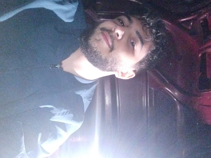 A young adult male, with dark curly hair and a trimmed beard and mustache, is depicted looking directly at the camera