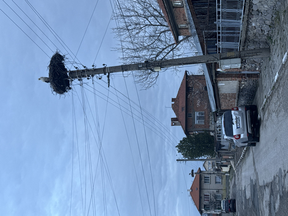 The image depicts a residential street scene in Dobrich, Bulgaria, under an overcast, light blue-grey sky. In the foreground on the right, a concrete utility pole, leaning slightly to the right, supports a large stork's nest. A single white stork with dark primary feathers stands prominently in the center of this nest, facing left. The pole is equipped with multiple insulators and numerous overhead utility wires that crisscross the frame. An asphalt street, showing signs of wear and repair, extends into the background, curving slightly to the left. A silver SUV, identified by its rear design and the Bulgarian license plate "X 4475 ML" (indicating Dobrich registration), is parked facing away from the viewer on the right side of the street, with its rear wheels partially on the concrete sidewalk. Further down the street on the left, a dark-colored hatchback is also parked. Along the street, properties are bordered by low stone and brick walls, and metal fencing is visible on the right. Residential buildings with reddish-brown tiled roofs are present in the background. On the right, a brick house is partially visible behind the utility pole. In the mid-left background, a two-story house with brick walls and a tiled roof stands, with a sparsely branched tree, possibly showing white blossoms, beside it. Another, smaller stork's nest is visible on a utility pole further down the street on the left. Bare deciduous trees are scattered throughout the background, indicating a dormant season, alongside one evergreen tree.