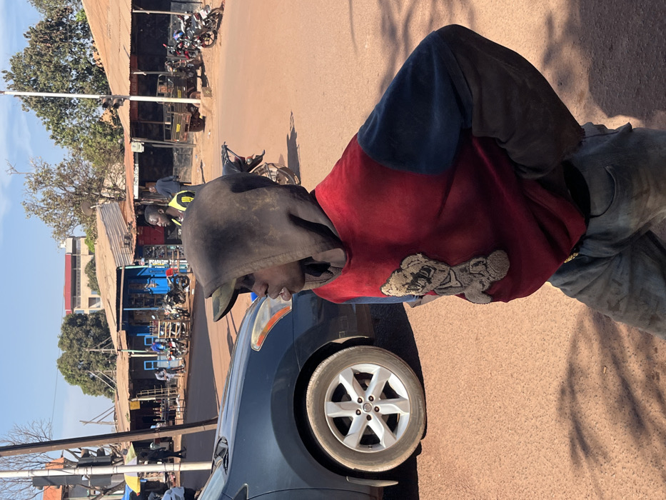 The scene depicts a street in Labé-Centre, Guinea, under bright sunlight. In the foreground, a young individual with dark skin stands partially obscured by a dark grey sedan. This individual wears a dark, dirty baseball cap beneath a dark, dirty hooded sweatshirt with the hood pulled up. Their primary garment is a red long-sleeve shirt with blue sleeves, featuring a large, light-colored embroidered teddy bear graphic with sunglasses on the front. Light-colored, dirty jeans are worn below the waist, secured by a dark belt. The individual's mouth is slightly open, and their gaze is directed towards the right. To the left of the foreground subject, the front-left section of a dark grey sedan, including its wheel and headlight, is visible. The ground surface is a reddish-brown, unpaved or dirt road. In the midground and background, an active street environment is present. Several single-story market stalls or shops with corrugated metal roofs line the road. One stall features distinct blue siding, with bottles and other merchandise visible. Numerous motorcycles are parked along the side of the road, and at least one three-wheeled utility vehicle is present. Multiple adult figures are visible in the background, walking or standing near the stalls. A tall, dark pole with a traffic light fixture is situated on the left side of the street. Further in the distance, a larger, light-colored building with a red roof is visible on an elevated position. The sky is clear blue, and trees with sparse foliage line the background.