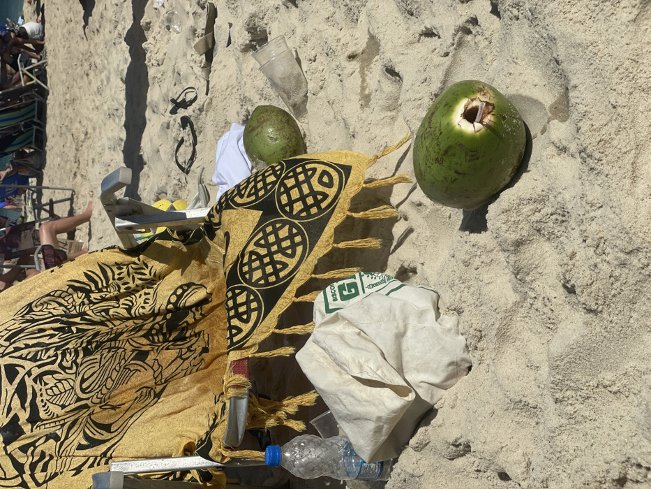 Beach scene with a yellow and black patterned sarong draped over a metal frame. Nearby are two green coconuts, one with a hole in the top. A white t-shirt and a light-colored fabric bag, possibly a reusable grocery bag, lie on the sand. A clear plastic cup and an empty water bottle are also visible. In the background, beachgoers sit in chairs under umbrellas. Flip-flops are scattered near the scene.