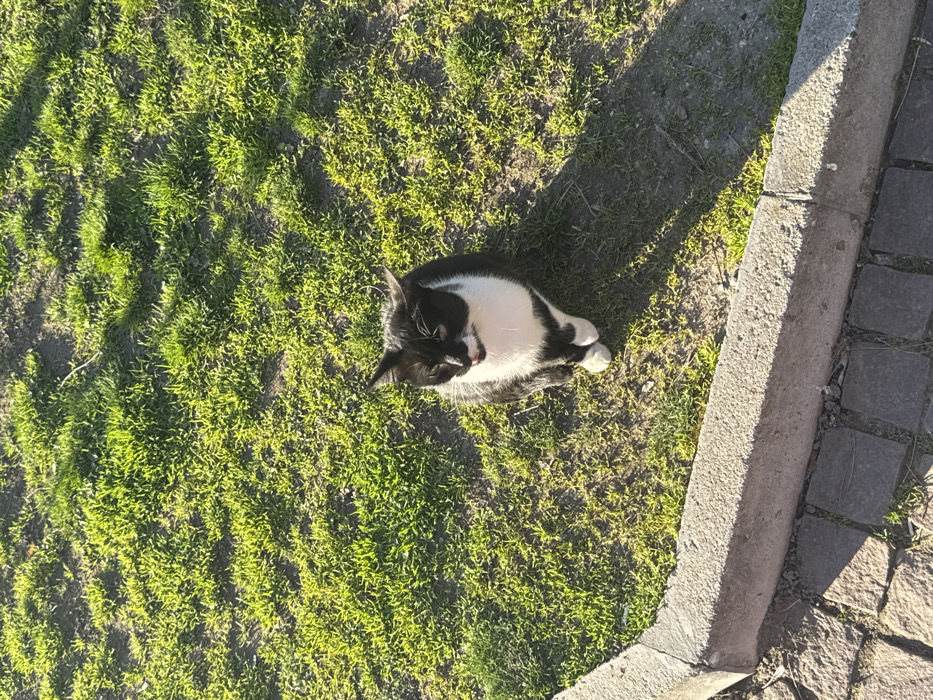 - "The image displays a black and white domestic cat seated on a patch of sparse green grass and dirt in Blagoevgrad, Bulgaria" by FM-mqHkz1, licensed under CC BY 4.0
