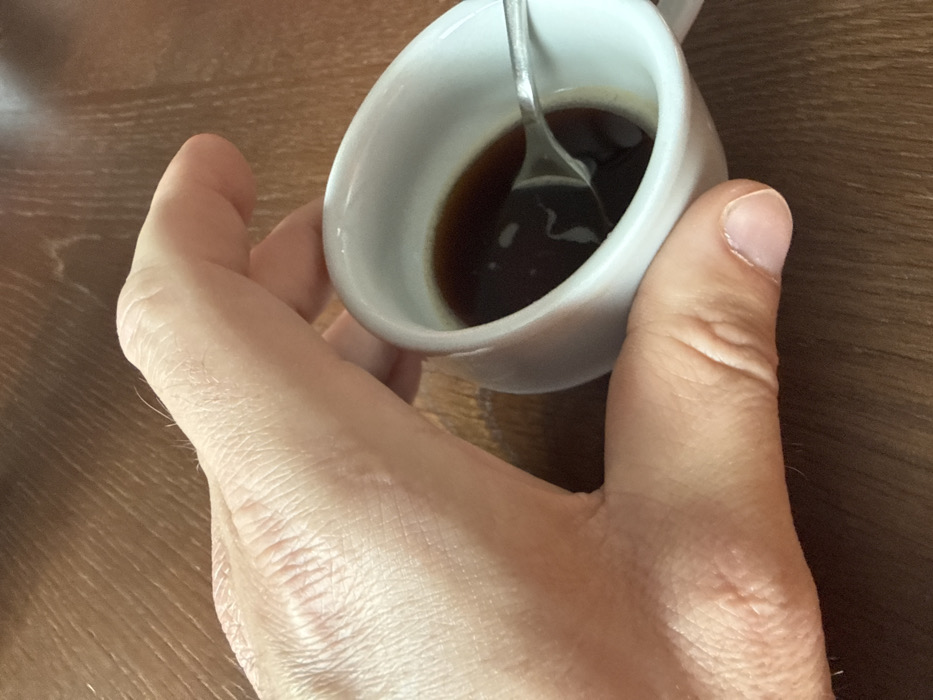A light-skinned human hand, exhibiting visible skin texture and sparse hair, holds a small, white ceramic cup. The thumb and partial index finger are visible supporting the cup. Inside the cup, a dark brown liquid, consistent with coffee or espresso, is present, with a small metallic spoon partially submerged within it. The cup and hand are positioned over a dark brown wooden surface featuring a distinct grain pattern. This scene is located in Marche-en-Famenne, Belgium.