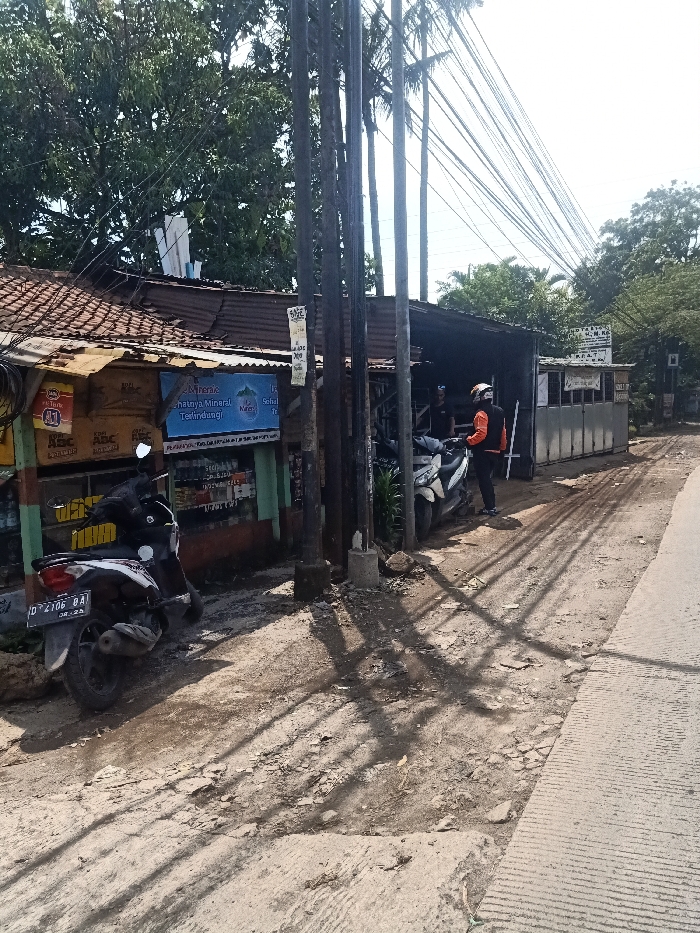 A weathered roadside scene features a couple of parked motorbikes near a small shop with a worn, corrugated metal roof. Utility poles stand nearby, casting long shadows across the uneven, dirt-patched road surface. In the distance, another shop or business establishment is visible, while trees and power lines dominate the background. A person in a helmet and an orange jacket is standing near the motorbike.