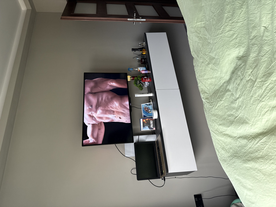 This image displays the interior of a room, likely a bedroom, situated in Devnya, Bulgaria. The walls are painted a light beige-grey, complementing a white ceiling trim. A flat-screen television is centrally mounted on the wall, exhibiting a close-up of a shirtless, highly muscular male torso and left arm, flexed, with a prominent nipple ring on the left pectoral. Directly beneath the television, a wall-mounted floating cabinet with a dark grey top surface and two white drawer fronts is installed. On the left side of this cabinet, a closed gold-toned laptop rests on a black stand, connected by black cables to a white rectangular device positioned behind it. The right side of the cabinet surface holds multiple objects: a PlayStation 5 game case titled "Call of Duty: Modern Warfare II," an upright framed photograph of an individual in water, a white cylindrical smart speaker, a small artificial plant, a gold-colored trophy, and various bottles including sprays, diffusers, and perfumes. To the right of the scene, a brown wooden door with two frosted glass panels is partially open, revealing a dark interior beyond. The door is equipped with a silver-colored handle. In the immediate foreground, a bed covered with a wrinkled, light green duvet or blanket is visible. On the lower left wall, a black electrical outlet is present, with a black cable plugged in and trailing downwards. No individuals are depicted in the scene.