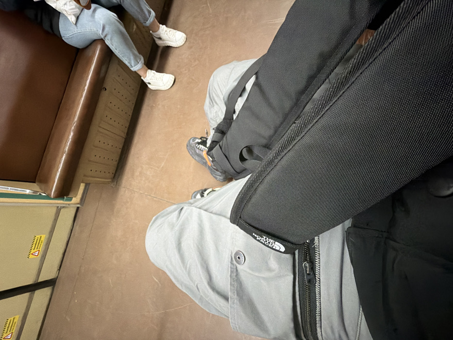 The image captures the interior of a public transportation vehicle, likely a subway or train car, from a seated, first-person perspective. The environment features a brown floor, light beige wall panels with black trim, and a fixed brown upholstered bench seat with a light beige, perforated base. A yellow triangular warning sticker with a black exclamation mark and foreign text is affixed to a wall panel. In the foreground, the photographer's legs are visible, dressed in light grey trousers with a buttoned pocket and a zippered pocket, paired with dark sneakers featuring white and orange accents. A black, textured bag or case bearing a "The North Face" logo tag rests across their lap, partially obscuring a black garment beneath. To the right, a second individual is seated on the brown bench. Their lower legs and feet are visible, clad in light blue jeans with rolled cuffs and white sneakers. A partial view of a black top and a white object is also visible near their lap. Both individuals appear to be passive occupants within the vehicle. The location in the city is Unknown, Unknown.