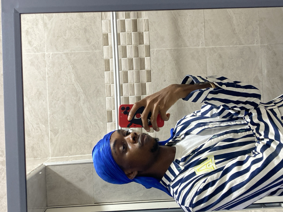 A person in a blue durag and striped shirt takes a mirror selfie