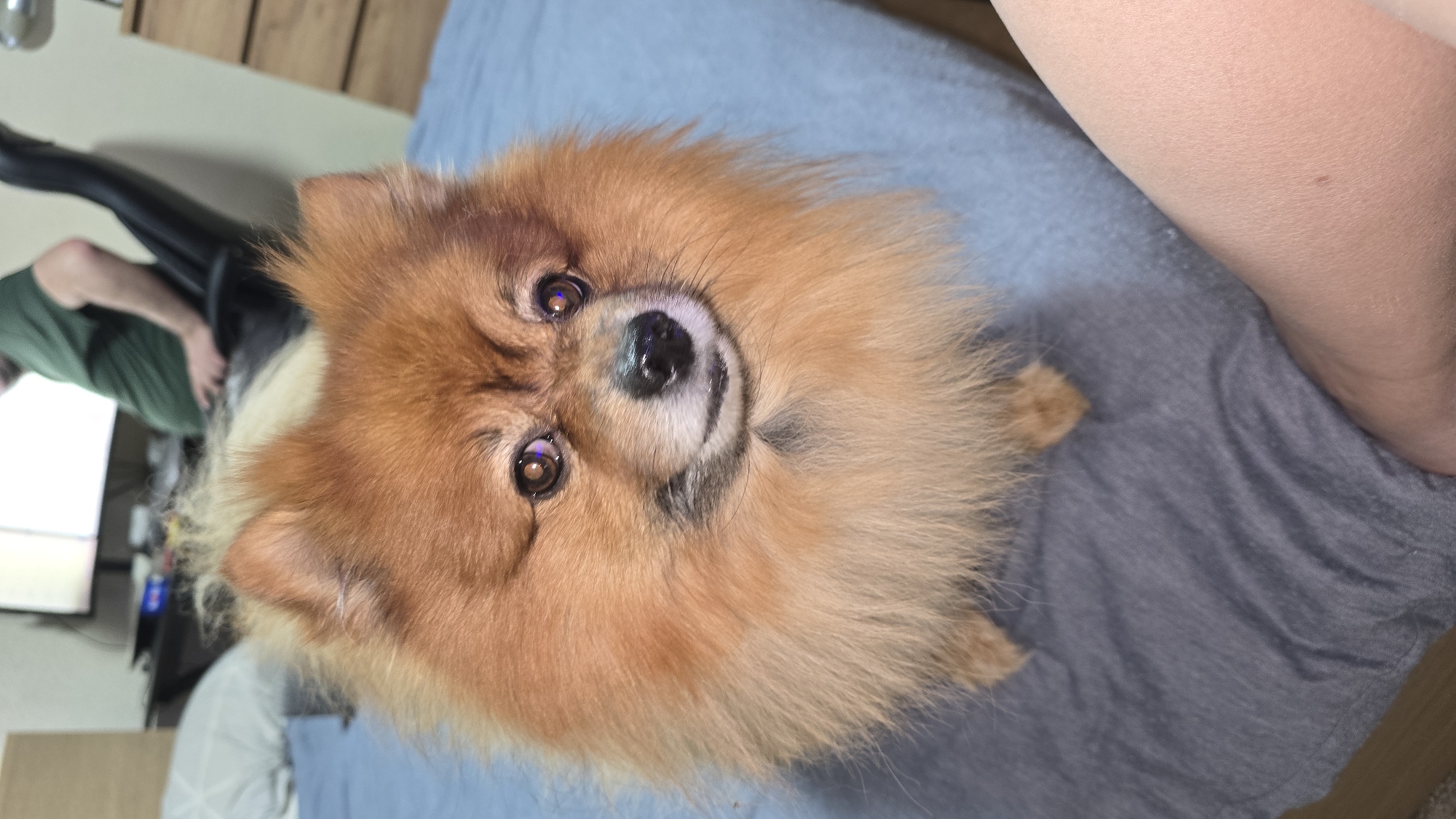 The scene is an interior of a room, located in the city of Helmond, Netherlands. A Pomeranian dog, characterized by its dense reddish-orange and lighter cream-colored double coat, is positioned on a bed, facing the viewer. Its dark eyes exhibit distinct purple-blue reflections, and its nose is black and appears moist. The bed is furnished with a light blue fitted sheet under a rumpled grey blanket or duvet. A fair-skinned human limb, likely a forearm or lower leg, displaying a small dark mole, is partially visible in the lower right foreground. In the background, a person wearing a dark green short-sleeved t-shirt is seated in a black office-style chair, positioned behind the dog. A quantity of light-colored, fluffy material, consistent with animal fur, is present on the seated person's lap. To the upper left of the seated individual, a television screen displays a bright white image. A light-colored wooden dresser or chest of drawers is partially visible on the far right. A white pillow with a grey geometric pattern rests on the bed in the upper left background.