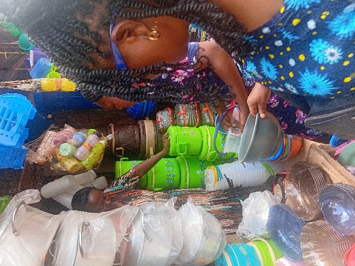 The scene depicts an active market stall in Ayangba, Nigeria, specializing in household goods, primarily plastic and aluminum kitchenware