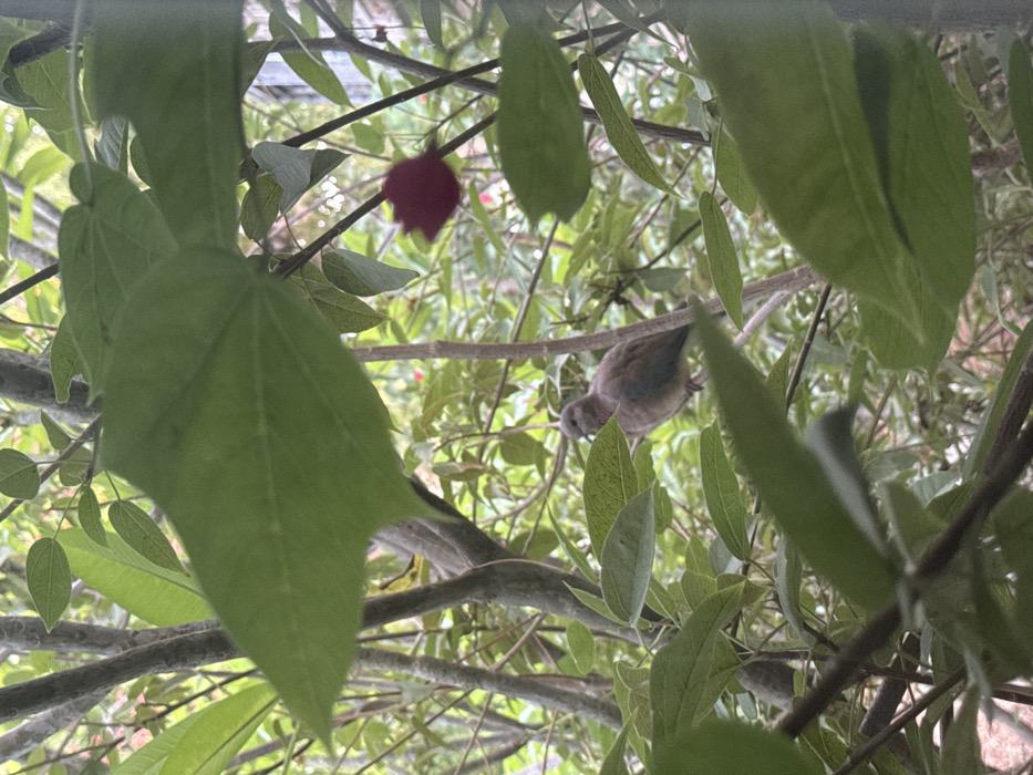 An image taken in the Gilboa Regional Council, Israel, depicts a small, light brown bird, possibly a dove or pigeon, perched on a tree branch, facing left. The bird's head is slightly turned towards the viewer. The scene is dominated by dense green foliage, with numerous leaves and branches partially obscuring the bird. Several large, green leaves are in the foreground, out of focus. In the upper right quadrant of the background, a single, out-of-focus red flower or bud is visible among the greenery. No people are present. The lighting is natural and diffused, suggesting an outdoor environment.