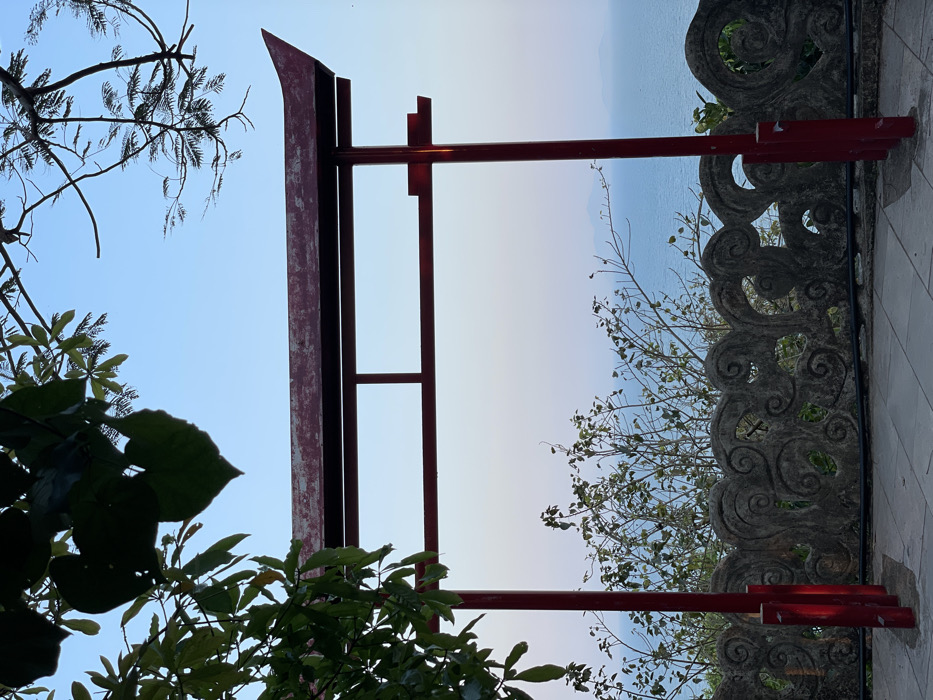 The image depicts an outdoor scenic overlook in Đà Nẵng, Vietnam, specifically from the Son Tra Peninsula, consistent with views from the Linh Ung Pagoda complex. Dominating the midground is a weathered red structure resembling a torii gate, composed of two vertical posts and two horizontal crossbeams. The uppermost beam exhibits a distinct upward curve at both ends. The red paint on this structure appears faded and displays minor discoloration. In the foreground, a light-colored paved or tiled surface extends beneath the archway. Immediately behind the red structure, a grey stone wall with intricate, swirling, wave-like carvings runs horizontally, partially obscured by the gate's posts. Beyond this carved wall, various green bushes and sparse foliage are visible, providing a natural barrier before the expansive view. The background features a vast, calm body of light blue ocean stretching to a hazy horizon. Faint outlines of distant landmasses or islands are discernable against the atmospheric haze above the water. The sky is clear, presenting a gradient from light blue overhead to a paler hue near the horizon line. Dark green leaves and branches from unseen trees frame the upper left and right sections of the photograph. There are no individuals, animals, or specific actions depicted in the scene. The lighting indicates natural daylight conditions.