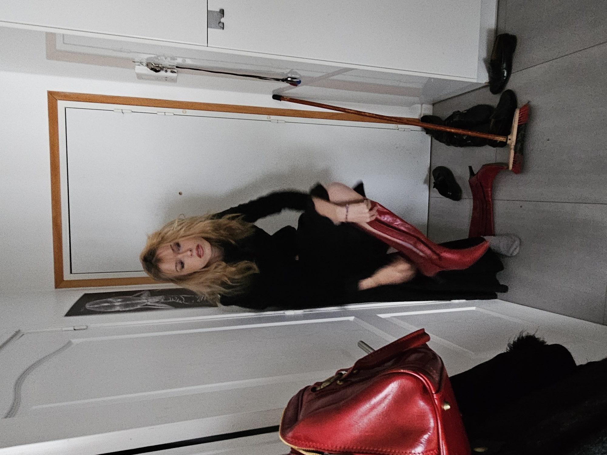 An interior scene captured in Pantin, France, depicts a young adult female in what appears to be an entryway or hallway. The subject, possessing long, wavy blonde hair and dressed in a dark, long-sleeved garment, is actively donning a pair of knee-high, shiny red boots. She holds the shaft of the right boot, which is partially on her leg, while her left foot, clad in a grey sock, rests on the floor. Her gaze is directed forward and slightly downward. The immediate environment features white walls and a grey tiled floor. To the left, a portion of a white door or wall hosts a red leather handbag with gold-colored hardware, hanging from an unseen fixture. Centrally, a closed white door with a light wooden frame is visible. To the right of the subject, a broom with a wooden handle and red bristles leans against the wall. Multiple dark shoes, resembling flats or loafers, are scattered on the floor near the broom. Further right, a white cabinet or appliance is partially visible. A key holder with multiple keys and a dark lanyard is affixed to the wall to the right of the wooden-framed door. A framed black and white image, possibly an anatomical print of a skull or ribcage, hangs on the wall to the left of the wooden-framed door.