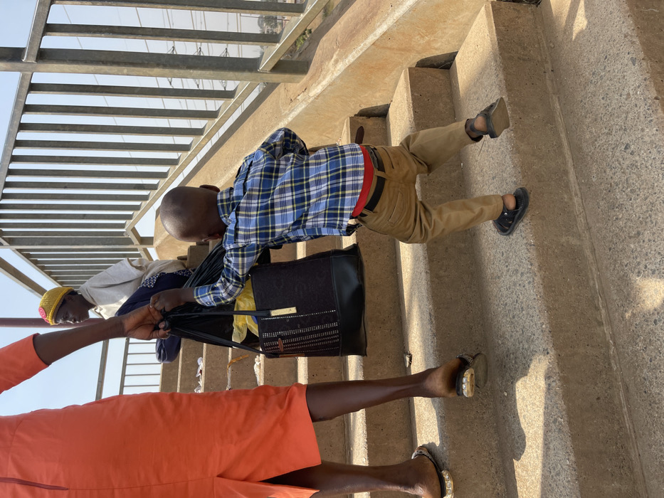 An outdoor scene in Kuchingoro, Nigeria, depicts three individuals on concrete steps leading upwards, likely part of a pedestrian overpass. In the foreground, partially visible on the left, an adult female with dark skin wears an orange dress and sandals with clear heels. She holds a large black tote bag, from which a yellow plastic bag protrudes. Immediately to her right and slightly behind, a young child with dark skin, wearing a blue and yellow plaid shirt, khaki pants revealing a red undershirt at the waist, and black sandals, ascends the steps while grasping the black tote bag. Further up the steps, in the background, another adult female with dark skin, wearing a yellow knitted cap and light-colored top, sits on the concrete steps. Metal railings run vertically alongside the right edge of the steps. The environment is brightly lit by natural sunlight, with a clear sky visible in the upper right background.