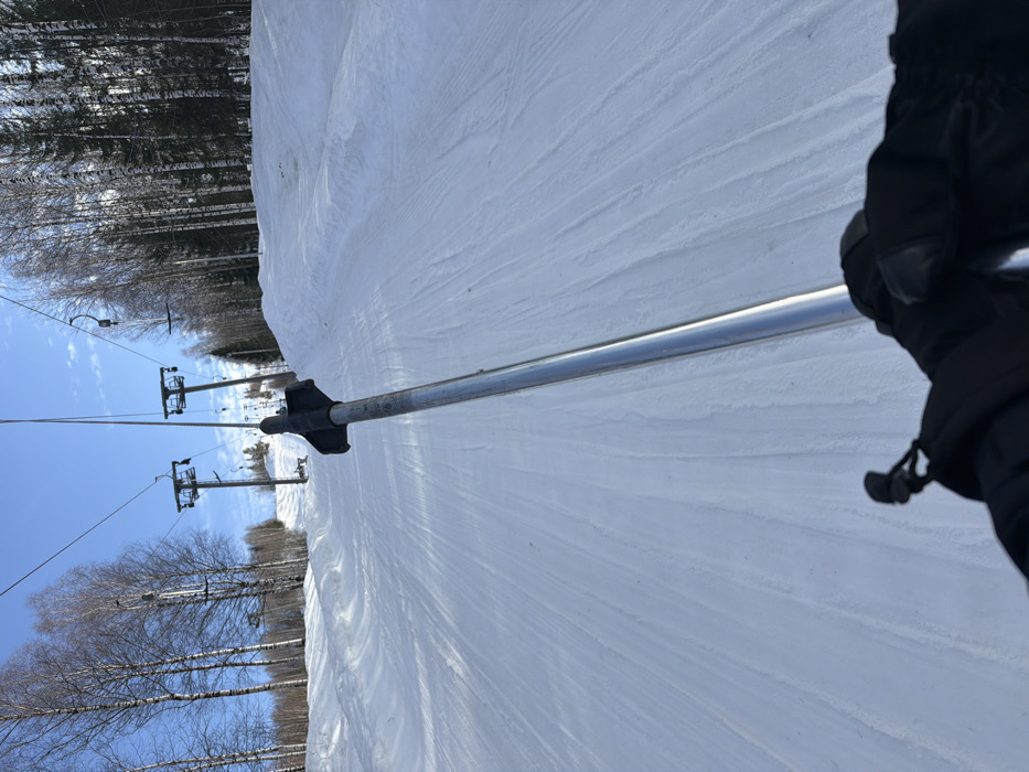 A first-person, uphill perspective captures a winter ski scene at an assumed location in Gubakha, Russia. In the lower right foreground, a hand encased in a black glove grasps a silver ski pole, which extends diagonally upwards and centrally across the frame. The ski pole features a black grip or basket near its upper end. The midground depicts a wide, groomed ski slope, entirely covered in white snow exhibiting parallel linear patterns from maintenance equipment, ascending into the distance. In the background, two prominent metal ski lift towers, indicative of a T-bar or platter lift system, are positioned along the ascending slope, connected by cables from which empty lift components are suspended. The left side of the slope is bordered by a forest of slender, bare deciduous trees, primarily birches, while the right side is flanked by a dense stand of evergreen trees. A clear, bright blue sky with minimal cloud cover dominates the upper portion of the scene.