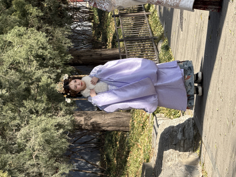 A woman in traditional purple robes with a white fur collar stands outdoors in a park. She has elaborate gold and white floral hair decorations. Trees and green vegetation surround her. A small wooden ladder lies on the grass. A stone pathway is visible to the right, with part of another person’s robe visible above.