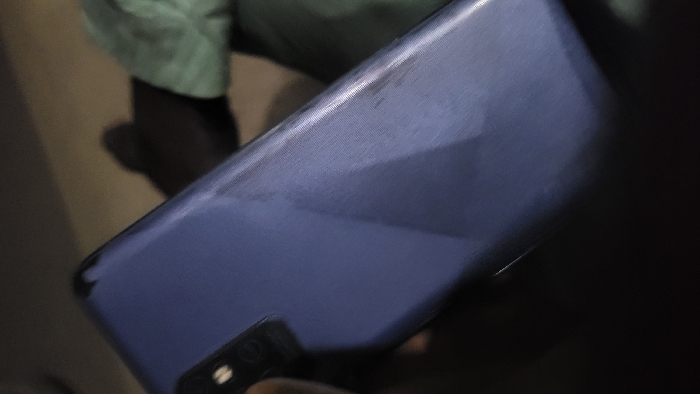 A blue smartphone rests in a dark setting, its back facing the viewer. The device features a subtle texture, and a camera array is visible in the lower-left corner. Light reflects unevenly across the back, suggesting a glossy or reflective surface. Parts of a person, including fabric and skin, are blurred in the background, hinting the phone is being held.