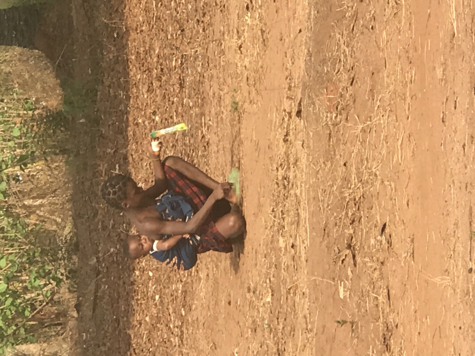 - "An outdoor scene in Egboje, Nigeria, features an adult female in a squatting posture on reddish-brown dirt ground, with an infant secured to her back by a blue patterned fabric wrap" by FM-sbehJ2, licensed under CC BY 4.0