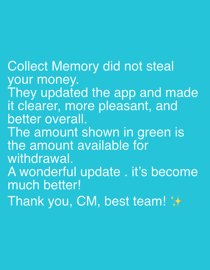 The image is a text-based graphic against a turquoise background. The text states, "Collect Memory did not steal your money." It continues, praising the app's update, calling it clearer, more pleasant, and better overall. It clarifies that the amount displayed in green is available for withdrawal. The author refers to the update as "wonderful" and ends with "Thank you, CM, best team!" accompanied by sparkling star emojis. The overall tone is positive and supportive of the Collect Memory app.