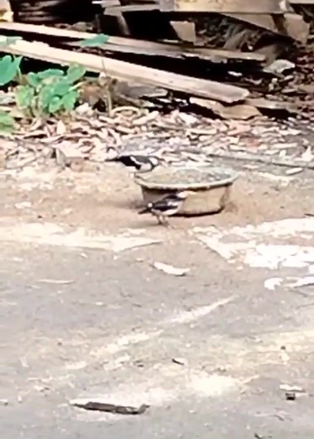 Two small birds are standing by a small, low dish on the ground. The birds are black and white, with slender bodies. They appear to be eating from the dish. The ground is dirt, and there are dry leaves and debris scattered around. In the background, there is a wooden pallet leaning against something out of view. There are some green plants visible on the left of the frame. A child's voice can be heard in the audio.