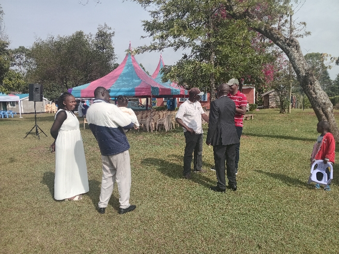 A group of people are gathered outdoors on a grassy lawn, seemingly for an event. A large, colorful tent is pitched in the background. Several adults are conversing, while one man holds a baby. To the left is a woman in a white dress and in the foreground, a child stands near a tree holding a white plastic chair. A speaker is placed on a stand. Buildings and lush trees are visible around the perimeter.