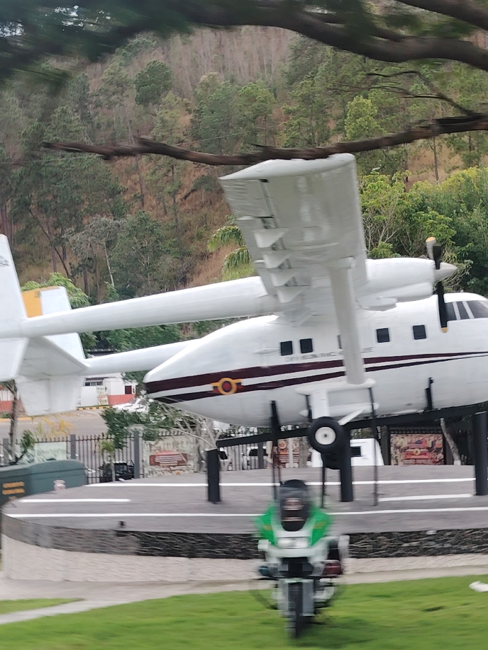A white military aircraft sits stationary on a concrete platform. The aircraft has a distinctive twin-boom tail and twin engines. The plane's fuselage features maroon stripes and what appears to be a circular insignia. A blurry motorcycle passes in front of the aircraft. Trees and a forested hillside form the backdrop. The scene appears to be a memorial or static display.