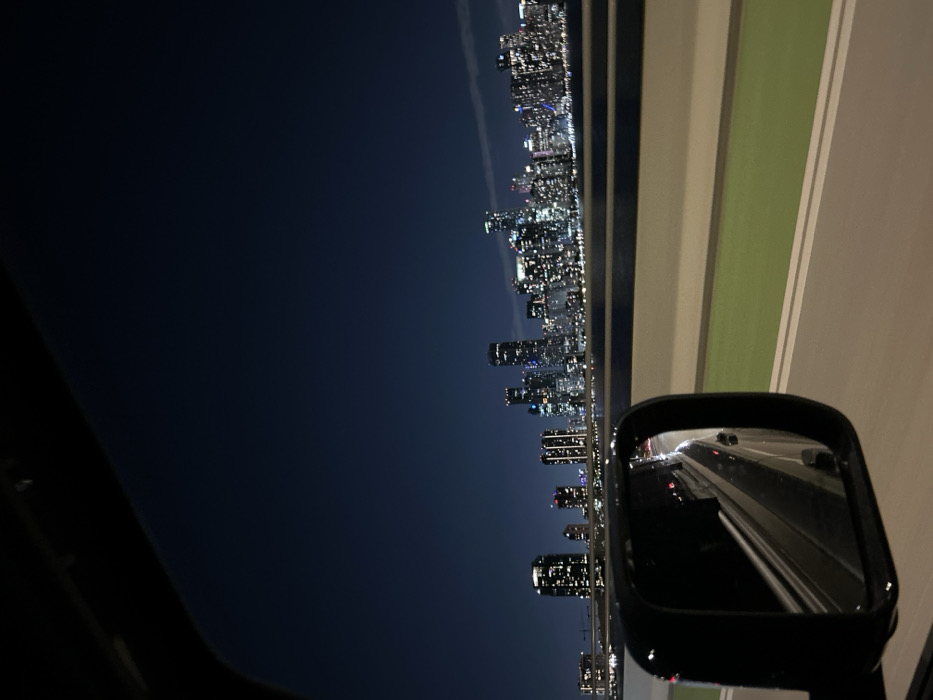 The image displays the illuminated Downtown Miami and Brickell skyline at night, viewed from a vehicle traveling on an elevated causeway over Biscayne Bay, Miami, United States. The top-left shows a dark section of the vehicle's interior. A black, rectangular side mirror is positioned in the lower-left quadrant, reflecting blurry vehicular lights on the road behind. The foreground consists of a multi-lane road surface, featuring grey asphalt with white lane markings and a distinct green-painted lane to the right. This roadway is separated by a dark barrier from the expansive body of water in the midground. The background is dominated by the brightly lit high-rise buildings of the Miami cityscape, set against a dark blue night sky with a faint, linear cloud formation visible in the upper right. No individuals are visible.