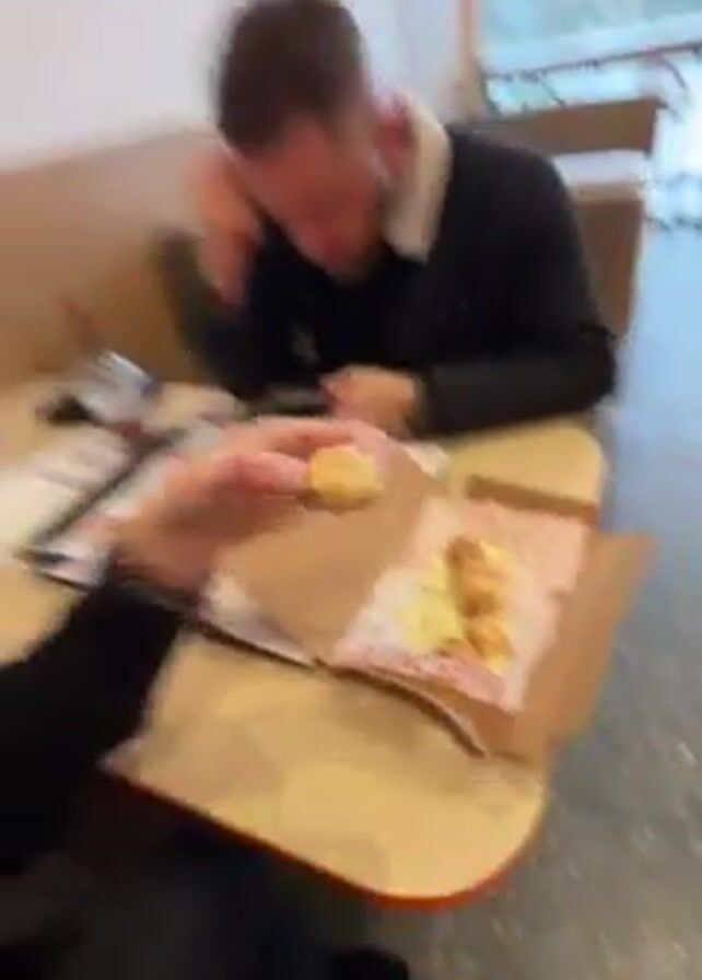 two people at a table in what appears to be a restaurant. A hand reaches into a cardboard box filled with small, round, golden-brown pastries covered in yellow sauce. A woman with long blonde hair takes one of the pastries and eats it, then makes a gesture with her hand, indicating enjoyment or satisfaction. She is wearing a black turtleneck sweater. A man is visible in the background, looking at a phone. The restaurant has framed posters on the wall, one featuring a tomato illustration and the words "Todo Pizza." The table is light brown.