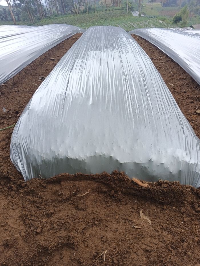 The scene depicts an agricultural field in Pinnwe, Myanmar (Burma). Multiple elongated soil mounds are covered with reflective, silver-grey plastic mulch film, arranged in parallel rows extending from the foreground towards a sloping background. The immediate foreground consists of reddish-brown soil, partially disturbed, with small plant debris visible. The plastic film, exhibiting wrinkles and a taut appearance, is secured at its base by mounded earth. Bare soil furrows separate the covered rows. In the background, a hillside is visible, covered with varying shades of green vegetation and trees, indicating a cultivated or natural landscape. No individuals, animals, or artificial structures other than the agricultural plastic are present.