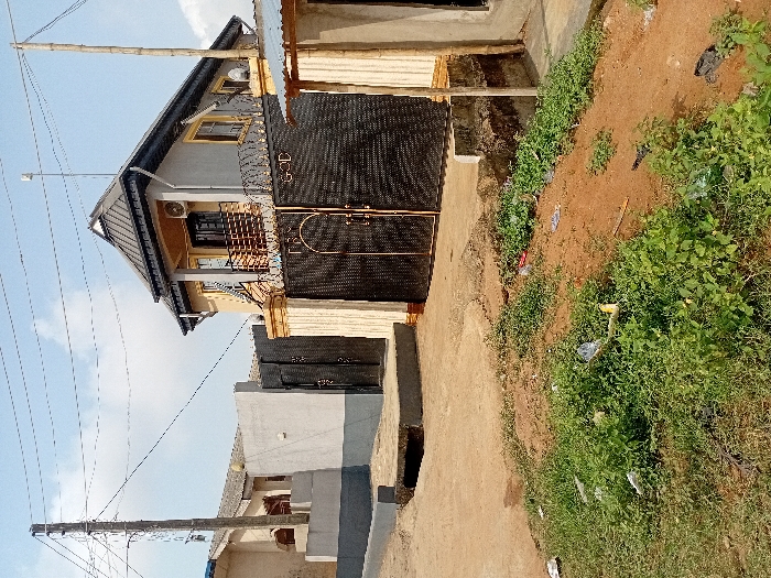 The image displays a daytime residential street scene, typical of urban or suburban environments in Lagos, Nigeria. The central subject is a two-story house with a grey main facade and beige accents around its windows and a small upper-level balcony featuring a black metal railing. An air conditioning unit is mounted on the wall above the balcony, and an antenna-like mast extends from the dark grey pitched roof. The property is secured by a substantial black metal gate inscribed with the word "GOD," framed by two light-colored concrete pillars with orange-gold caps. Barbed wire or razor wire runs along the top of the perimeter wall above the gate. To the left, a tall wooden utility pole supports multiple exposed electrical or communication lines that crisscross against a partly cloudy sky. Partially visible behind a grey concrete fence is another single-story residential structure with a grey roof. To the immediate right of the main house's gate, a smaller single-story building with a corrugated metal roof is present. The foreground consists of an unpaved, reddish-brown dirt area with interspersed green vegetation, including grass and small bushes. This ground contains scattered litter, primarily plastic bags and wrappers. A concrete drainage culvert is visible on the left, leading to a semi-paved or concrete section directly in front of the main house's gate. No people or animals are present in the scene, and no active interactions are occurring.