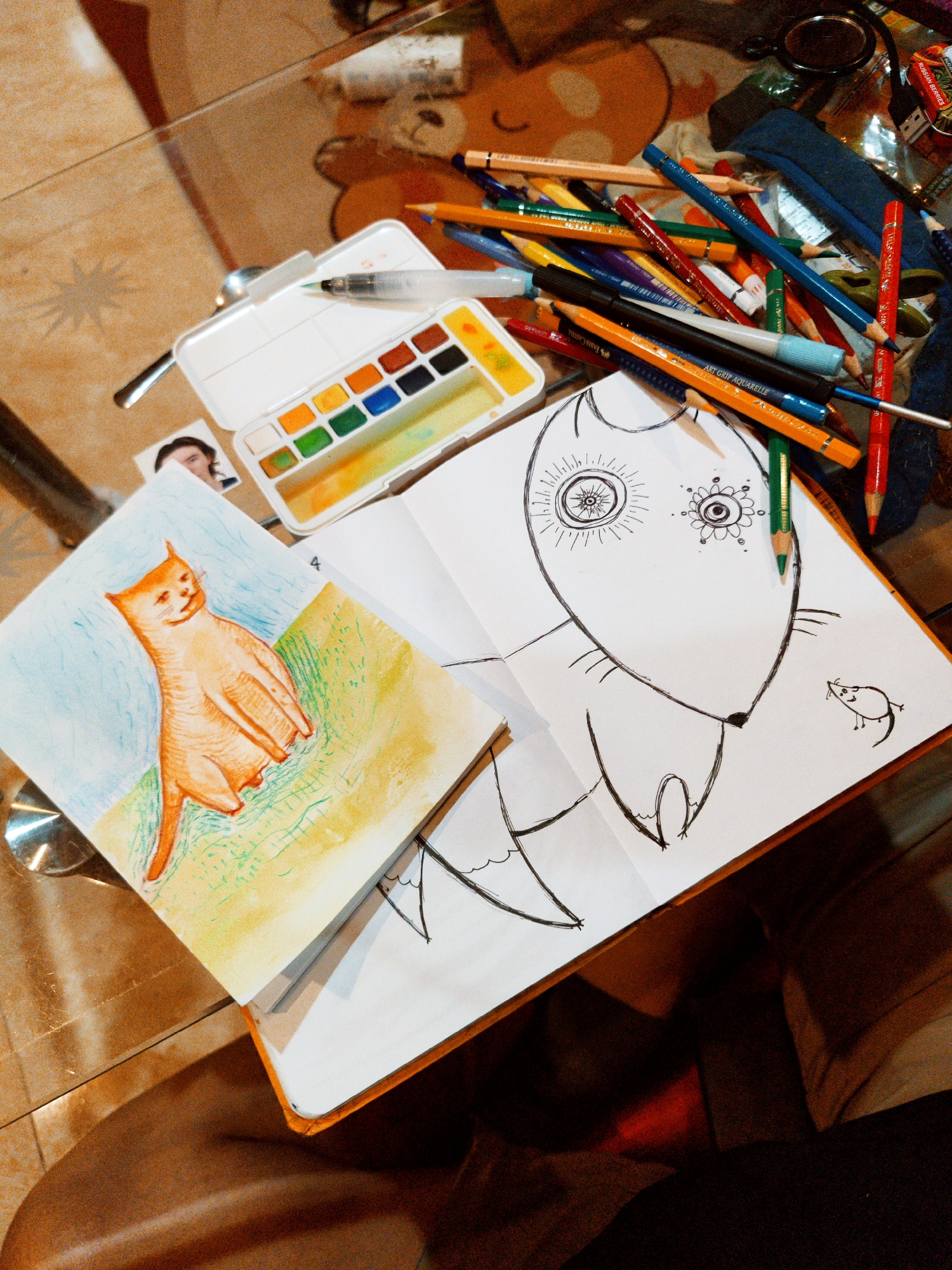 The image depicts a tabletop still life of art supplies and artwork. Dominating the scene is an open sketchbook with a line drawing of a stylized fox featuring intricate designs within the head. To the left is a watercolor painting of an orange cat with elongated limbs and a somewhat pained expression, set against a blue and green background. Above the sketchbook, there's a watercolor palette, a water brush, and a scattering of colored pencils. A small photograph is partially visible under the palette. The tabletop surface is reflective, suggesting glass, and reflects surrounding items. Below the tabletop, part of a person’s leg is visible. Based on previous location information, the location is Cam Ly - Da Lat, Vietnam.
