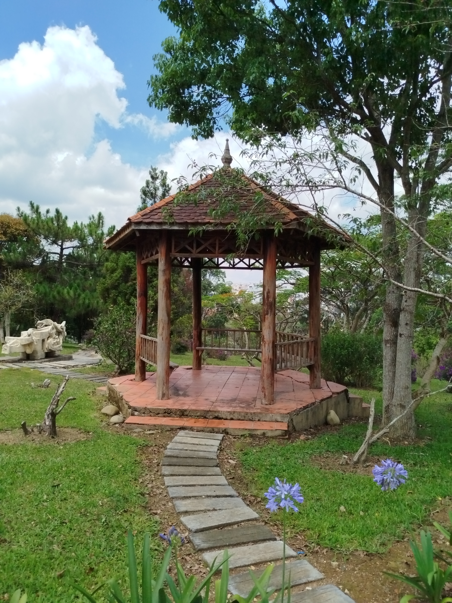 The image depicts a gazebo in a park setting, likely within the city of Lâm Viên - Đà Lạt, Vietnam, characterized by its distinct architectural style and lush greenery. The gazebo is the central focus, featuring a reddish-brown tiled roof with a decorative finial at the apex. The structure is supported by wooden pillars, and there are wooden railings visible along the perimeter. The gazebo's floor is also tiled in a similar reddish-brown hue. A winding pathway constructed of gray rectangular stone slabs leads to the gazebo. The surrounding environment is comprised of a well-maintained green lawn interspersed with flowering plants, including blue Agapanthus blooms. Several mature trees are present, partially obscuring the sky, which is light blue with some white clouds. In the background, more trees and foliage can be seen. To the left of the gazebo, partially obscured by trees, there is a large stone sculpture.