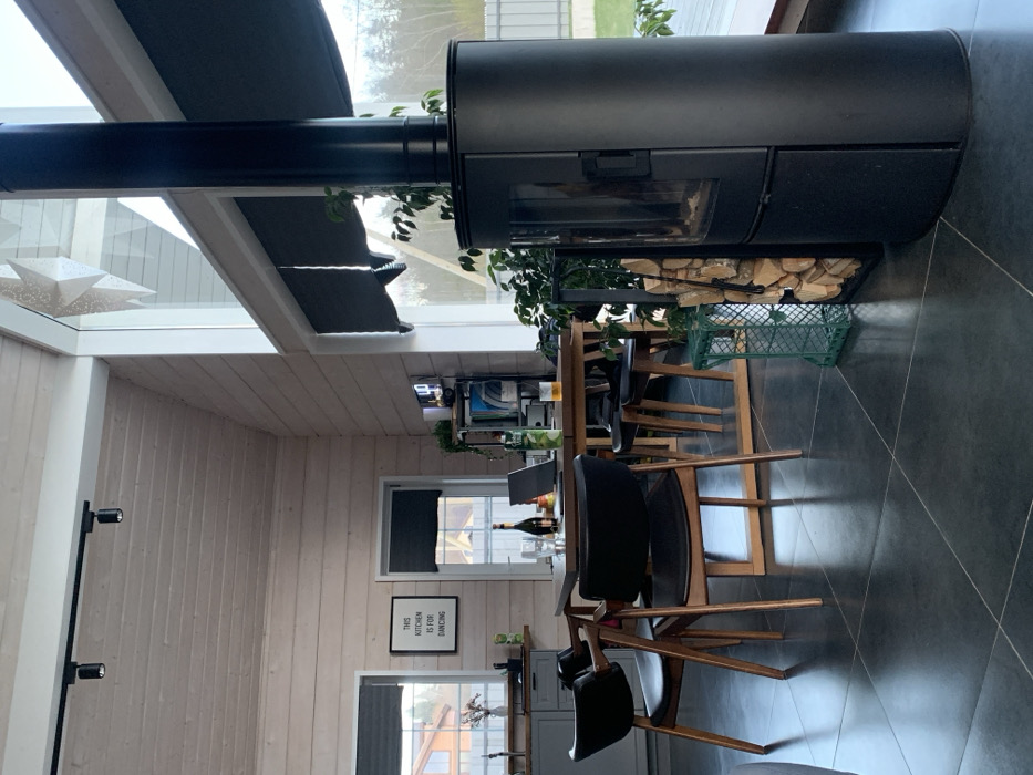modern kitchen in a house located at 60.548 latitude, 29.796 longitude in Svetloe, Russia. There is a black wood-burning stove with a basket of wood next to it. The stove is against a large window with black blinds. There is a wooden dining table with four chairs, two of which are empty, in the foreground. The table is set with glasses and a bottle of wine. On the wall to the left is a framed sign that reads "This kitchen is for dancing." There is a plant in the corner, near the stove. The floor is tiled and the walls are white and made of wood. The kitchen is well-lit and appears to be in a modern, well-kept home.