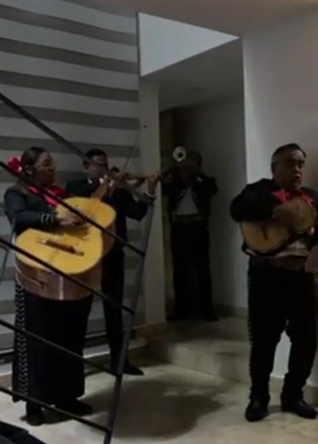 A mariachi band is performing on the ground floor of a building, near a staircase