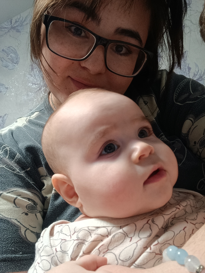 The image captures an adult female holding an infant in an indoor setting, identified as the city of Noviy, Russia. The adult, positioned behind and slightly to the left of the infant, is visible from the shoulders up. She has dark hair styled with bangs, wears black-framed eyeglasses, and exhibits a subtle smile with her gaze directed slightly off-camera to the viewer's right. Her attire is a dark-colored top with a light-colored, repeating pattern, and a thin silver chain is visible around her neck. The infant, prominently in the foreground, is visible from the head to mid-torso, featuring light skin and blue eyes, looking upwards and to the viewer's right. The infant wears a light-colored onesie patterned with small pears. A small, light blue beaded object, likely a pacifier clip, is partially visible in the lower right corner. The background consists of a light-colored wall adorned with a faint, repeating floral or shell-like pattern in a light blue or purple hue.