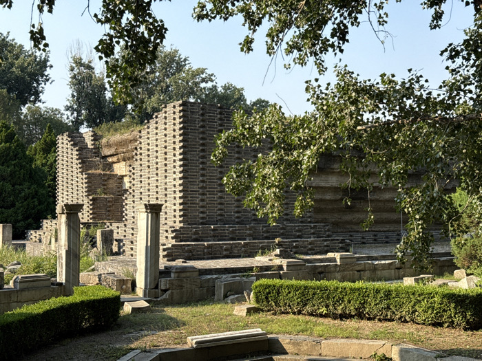 The photo captures the ruins of an ancient brick structure amidst greenery. Parts of the structure are terraced and feature columns. Lush trees frame the scene, partially obscuring the ruins and adding a touch of nature's embrace. The scene suggests a historic site, where nature and time have intertwined with the remnants of the past.