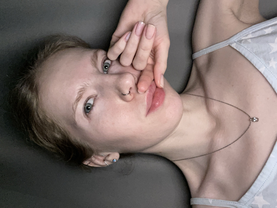 A single individual, identified as an adult female, is depicted in a close-up portrait against a plain, dark gray background. The individual has fair skin, light-colored hair, and light-colored eyes, which are directed forward. Subtle freckles are visible across the nose and cheeks. Her right hand (viewer's left) is raised, with the thumb touching the lower lip and the forefinger resting against the chin area. The fingernails on the visible fingers are short and appear to have a natural, light pink finish. Multiple piercings are present on the individual's left ear (viewer's right), including a small stud in the helix, a small barbell in the outer helix, a small hoop with a light blue iridescent stone in the lower helix, and a small stud in the lobe. A small, silver-colored hoop nose ring is visible on the left nostril. A slender, silver-colored chain necklace with a small, teardrop-shaped or abstract pendant is worn around the neck. The individual is wearing a light-colored (likely white or very light blue) sleeveless top or camisole featuring a repeating pattern of small stars, with one strap visible on the right shoulder (viewer's left). The environment consists solely of the dark gray background, offering no discernible features to indicate a specific location. The location within Izhevsk, Russia, cannot be determined from the provided image.