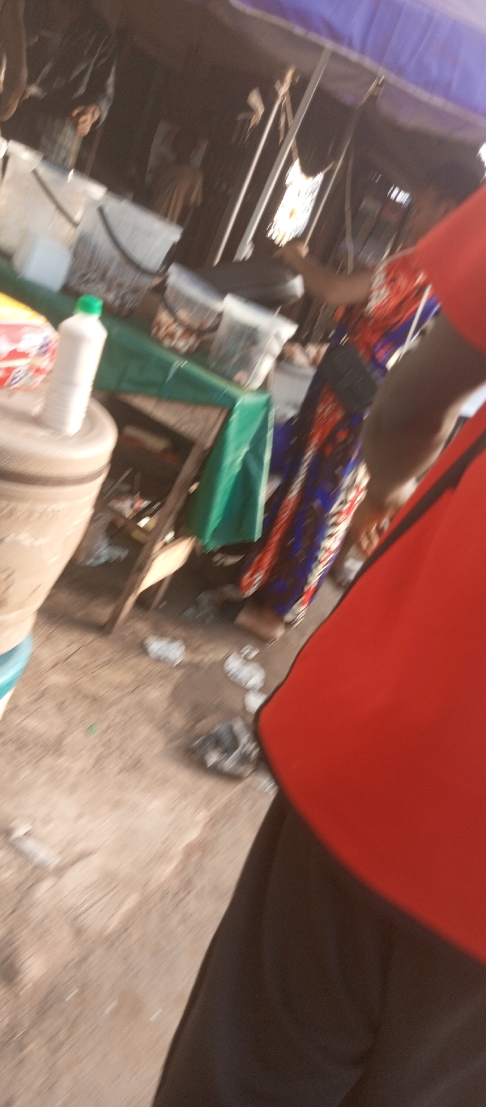 The image depicts a blurry, eye-level view within an indoor or covered market environment in Agbani, Nigeria