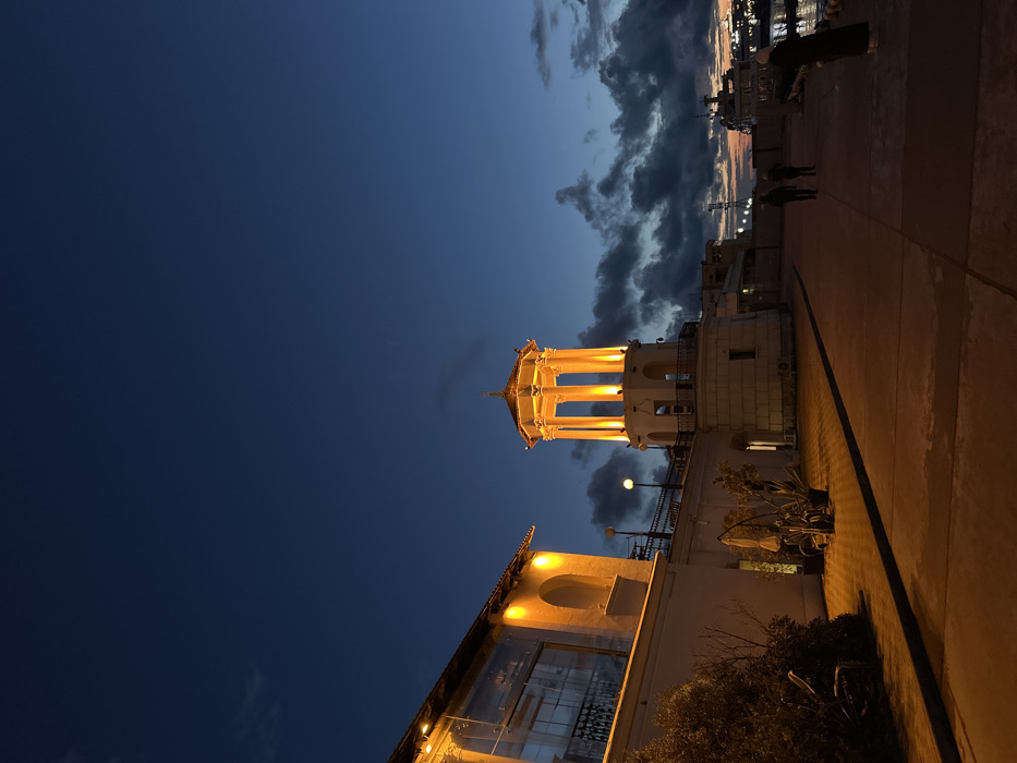 The image presents a dusk scene at the Sochi Sea Port in Sochi, Russia. A distinct, classical-style rotunda, brightly illuminated with warm yellow light, stands prominently in the mid-ground on a waterfront promenade. The rotunda features columns and a dome, resting on a cylindrical base with a railing. To the left, a multi-story building, also illuminated with warm yellow light, displays arched windows or balconies and glass sections. The foreground is dominated by a dark paved promenade, reflecting the artificial light. Moving into the mid-ground, two indistinct human figures walk away from the viewer along this path. In the right foreground, a third human figure, clad in dark clothing with lighter internal lining or sleeves, stands facing away from the viewer with arms extended horizontally. To the right of the rotunda, a body of water, likely the Black Sea, is visible, with a large vessel or yacht docked in the distance. The background horizon on the right exhibits a faint orange and pink glow from the setting sun, contrasting with the dark blue twilight sky above, which contains scattered dark clouds. Distant structures, possibly buildings or power lines, are visible along the far shore. Artificial light sources, including streetlights, contribute to the scene's illumination.