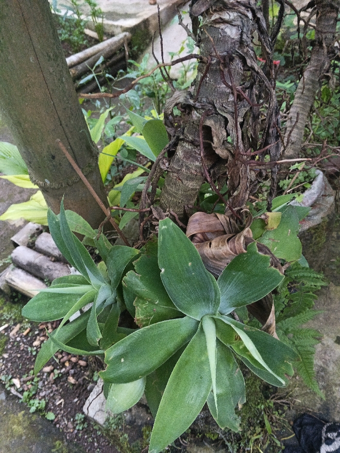 A high-angle, close-up photograph captured in São Félix do Xingu, Brazil, depicts a dense arrangement of botanical elements. In the foreground, two green plants with broad, smooth leaves arranged in a rosette pattern are visible; one is prominent in the lower right, and another smaller specimen is to its left. Behind these, several dried, light brown, curled leaves are present. A light brown, segmented bamboo culm runs vertically along the left side of the frame. To its right, a dark brown, gnarled tree trunk is heavily covered with numerous thin, reddish-brown aerial roots or vines. The ground consists of dark soil, interspersed with small stones and minimal green foliage. In the blurred background, lighter green vegetation and light-colored, angular structural debris are discernible. A dark fabric object, possibly clothing, is partially visible in the bottom right corner of the image. No individuals or explicit actions are depicted.