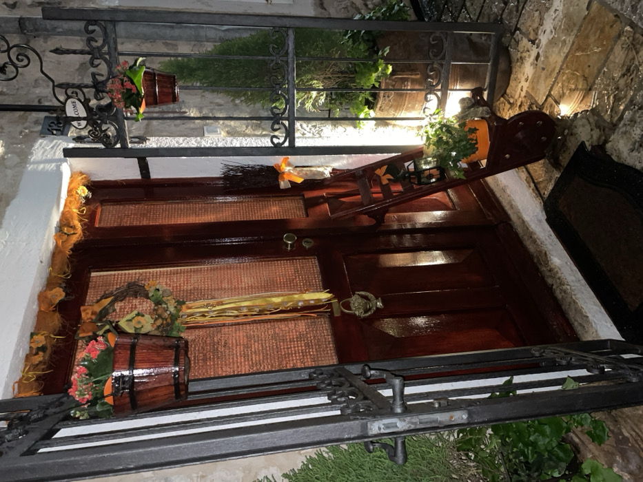 - "A dark brown door is decorated for fall with a broom, a wreath, and orange foliage" by FM-srcYD2, licensed under CC BY 4.0