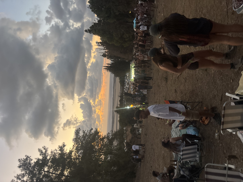 An outdoor gathering is depicted at sunset in a hilly, wooded area, consistent with the terrain of the Hof HaCarmel Regional Council, Israel. The sky displays orange and yellow hues at the horizon, indicating sunset, beneath a canopy of dark grey, clumpy clouds. In the far distance, a body of water (likely the Mediterranean Sea) is visible, with coastal plains or fields between it and the event. The foreground consists of dry, reddish-brown earth. On the left, a male in a white t-shirt and khaki shorts stands, looking towards the viewer. Behind him, a female with long dark hair is seated on a striped blanket, facing left and conversing with another partially visible individual. Several striped folding chairs are present, some unoccupied. In the mid-ground, two females with long dark hair and caps are seen from behind on the right, standing amidst a larger, densely packed crowd of approximately 50-70 people. This crowd occupies a significant portion of the mid-ground, appearing to be at a music event or party. A brightly lit white structure, possibly a food stall or bar, is visible within the crowd towards the right. Speaker stacks are discernible to the left of this structure, accompanied by temporary lighting. The background features numerous vehicles parked in rows on an elevated area, suggesting an event parking lot. Dense evergreen trees, including pines and cypress, frame the scene on the left, right, and in the distant mid-ground.