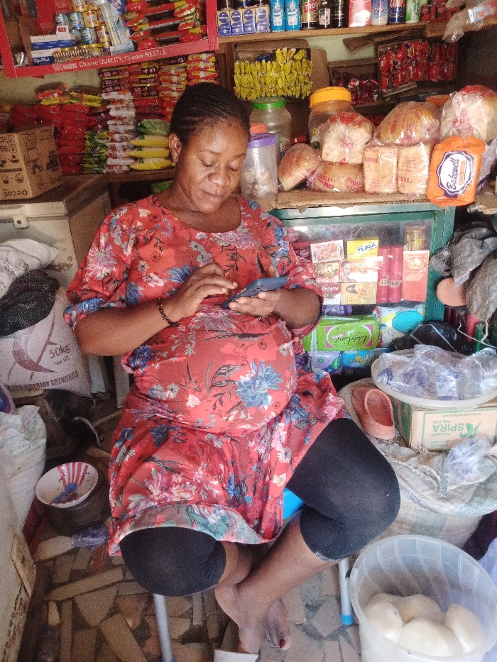 The image depicts an indoor commercial setting, specifically a small provision shop in Sabon Tasha, Nigeria. An adult female, appearing pregnant, with dark skin and braided hair, is seated on a low stool, wearing a red floral dress with blue and green patterns over black leggings. She is actively focused on a dark-colored smartphone held in both hands. Her bare feet, with red nail polish on the big toes, rest on the tiled floor. The shop is densely stocked with various consumer goods. Upper shelves display numerous packaged items, including sachets, bottles, and boxes, with some Nestlé branding visible. Below these shelves, a glass display case contains smaller packaged goods, including personal care products such as "TURA" lotion and "Lady Care" sanitary pads. Several loaves of packaged bread, some identified by "Babewell" branding, are arranged on a surface above the glass case. Large plastic and glass jars are also present. On the floor, to the left of the woman's feet, is a white bowl with red stripes containing a blue object. To her right, a clear plastic bucket holds multiple white, oval-shaped items. A pair of orange sandals rests next to the bucket, atop a cardboard box labeled "SPIRA." A plastic bag filled with numerous individual clear plastic bags of liquid is also positioned on this box. A large white sack marked "50kg Net Wt. Nigerian Breweries" is visible on the floor to the far left.