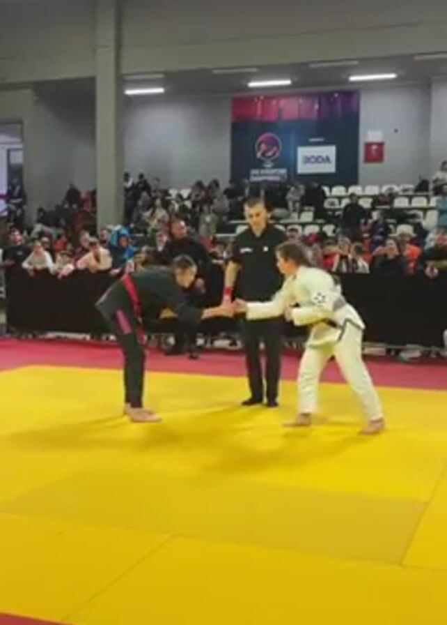 In an indoor arena, two female martial arts competitors face each other, a male referee stands between them