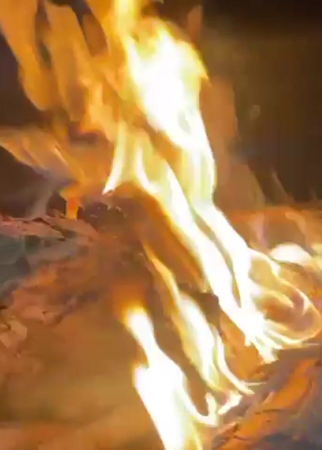 close-up of a campfire burning brightly at night. Logs are stacked on a flat, light-colored surface, possibly a table or vehicle hood. The flames are orange and yellow, rising high in the dark. There is minimal ambient light. Sounds of speech are audible.