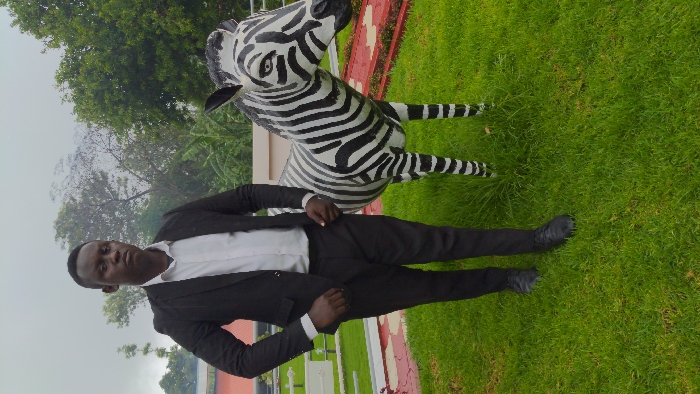 An adult male stands outdoors in a landscaped area within Kondeni, Tanzania