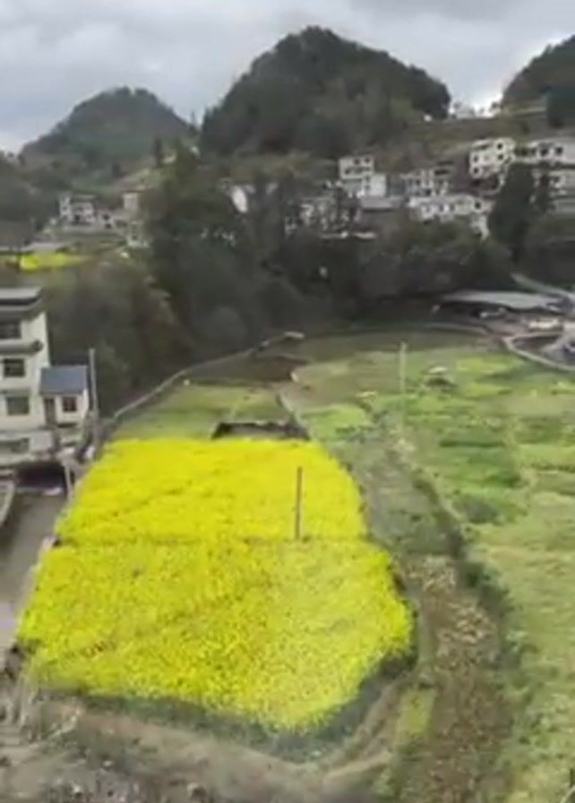 rural landscape from an elevated perspective, likely from a moving vehicle such as a train or bus. In the foreground, there is a field of bright yellow flowers. Adjacent to it is a field with green crops. Behind the fields, there are traditional village houses clustered on a hillside. The architecture appears simple and similar in style. The background consists of green, tree-covered hills. The sky is overcast and grey. Fences and concrete structures are visible in the immediate foreground, suggesting the viewpoint is from a constructed platform or vehicle.